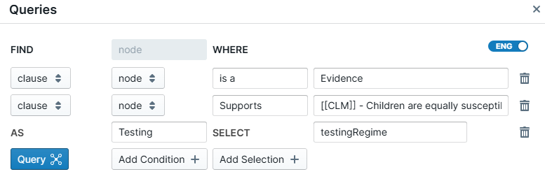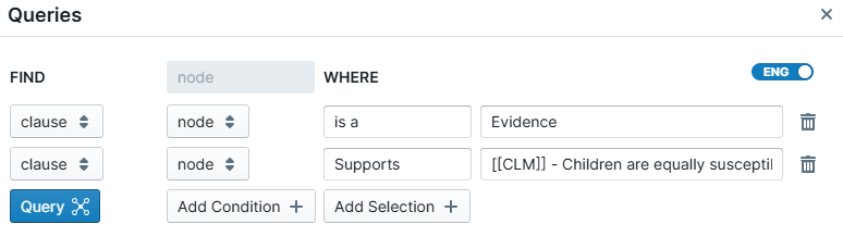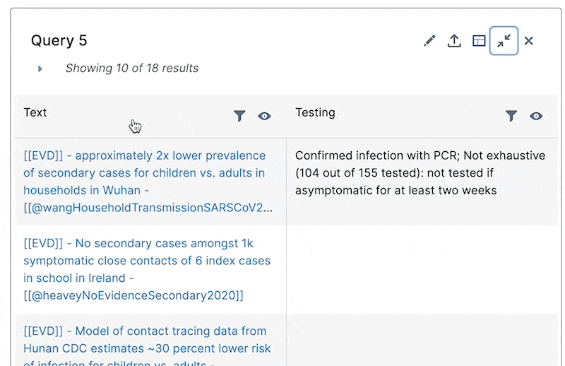 The query drawer component allows you to construct structured queries over your discourse graph, based on discourse relations (e.g., "find all evidence that supports/opposes a claim"), and reason over the results in a structured, tabular format (e.g., "find all evidence that supports a claim, and allow me to filter/sort by methodological details").